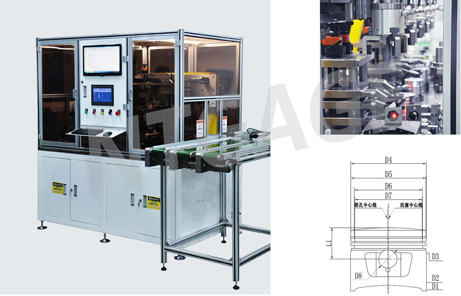 利用傳送帶自動上料,機械手抓取工件并自動檢測工件裙部直徑、環槽直徑、銷孔直徑和壓縮高。